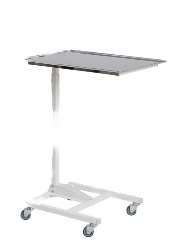 Телескопическое устройство каркаса позволяет регулировать высоту от 790 до 1250 мм. Каркас столика изготовлен из стального профиля, покрыт экологически чистым, эпоксидным полимерно-порошковым покрытием, устойчивым к регулярной обработке всеми видами медицинских дезинфицирующих и моющих растворов.