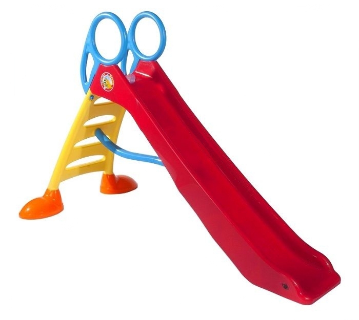 Аккуратная пластиковая горка с функцией подключения воды позволяет устроить на уличном участке или в помещении мини-аквапарк. Для большей устойчивости конструкции между ступенями и скатом предусмотрено дополнительное ребро жесткости.