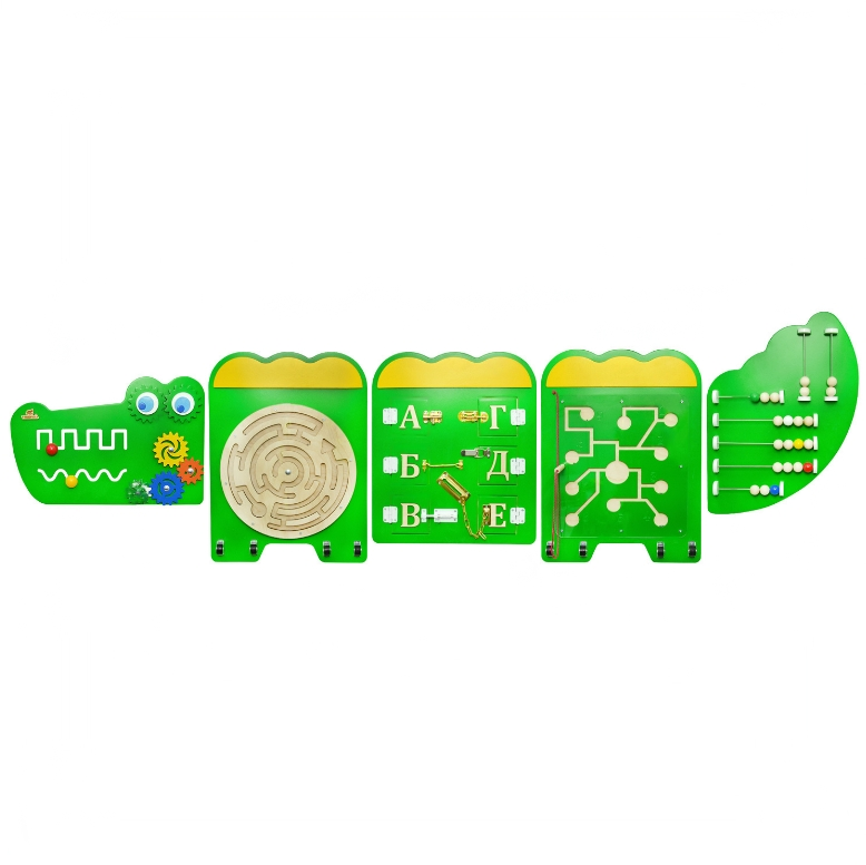Бизиборд "Крокодил" развивающий комплекс из панелей с элементами развития моторных функций, для обучения счету, различия форм и цветов.
