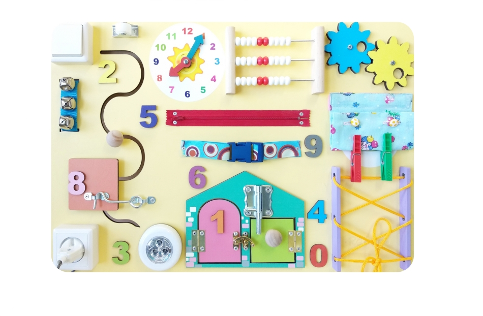 Развивающая доска изготавливается из натуральных материалов и окрашивается стойкой гипоаллергенной краской. Обратная сторона панели закрывается.