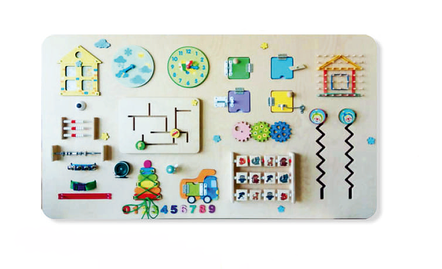 Детали крутятся и передвигаются, оставляя сильное впечатление в памяти ребенка. Занятия с бизибордом положительно влияют на концентрацию внимания, координацию движений, речевые навыки, способность к логическому мышлению.