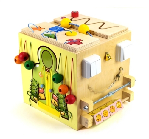 Бизикуб предназначен для развития мышления, логики, воображения и мелкой моторики.