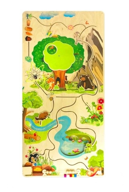 Бизиборд предназначается для кабинета психолога, логопеда или рекреационной зоны ДОУ. На красочной панели с настенным креплением изображаются животные и места их обитания. Фигурки передвигаются по желобам рельефного лабиринта. Дошкольник тренирует память и развивает внимательность, оттачивает координацию движений.