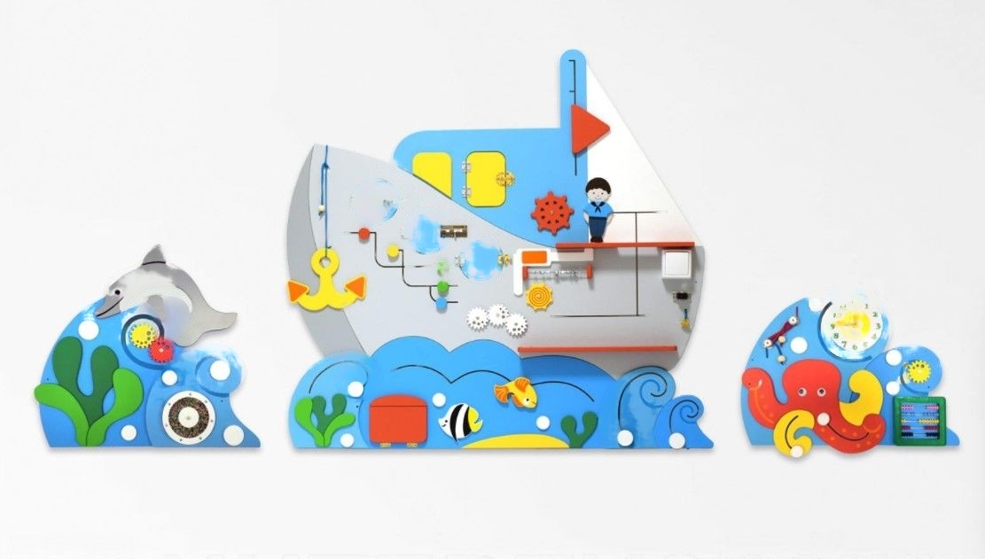 Элементы для развития моторики вертятся, издают звуки, стимулируют цветоразличение. Оборудование подходит для кабинета психолога, логопеда или рекреационной зоны ДОУ.