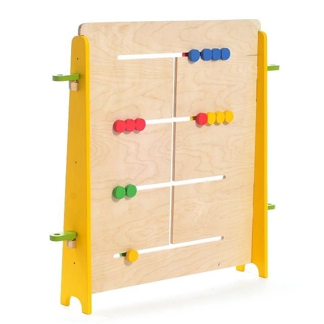Панель на боковых подставках украшена резным лабиринтом с цветными элементами на отдельных ветвях. Дошкольник передвигает кругляшки, обучаясь счету и сортировке. Тренажер для кистей рук подходит лицам с ОВЗ.