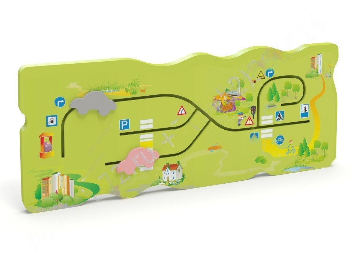 Панель с тактильным лабиринтом поможет закрепить знания в области ПДД. Ползунок в форме машинки перемещается вдоль прорезей с учетом рисунков сбоку (дорожных знаков, пешеходного перехода).