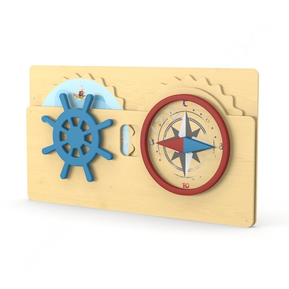 Панель с крутящимися деталями (якорем и компасом) задействуется в сюжетно-ролевых играх. С ее помощью ребенок учится определять стороны света, развивает воображение, координацию движений. Углы тренажера закруглены.