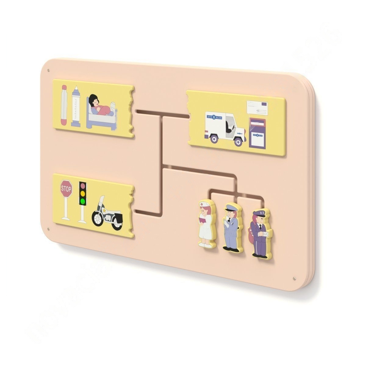 Игровая панель оснащена тематическим лабиринтом из прорезей. Есть подвижные элементы (фигурки врача, инспектора ГАИ, почтальона). В конце каждой из 3-х веток изображены характерные атрибуты их профессий, транспорт. Ребенок учится находить соответствие между картинками, запоминает факты, тренирует точность движений при прохождении лабиринта.