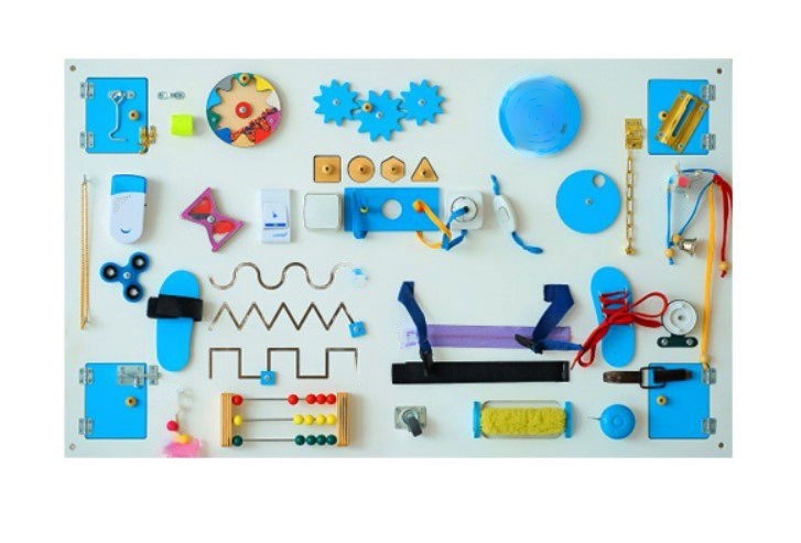 Покрытие выполнено с использованием безвредных красок на водной основе. Бизиборд наполнен множеством мелких интерактивных элементов: дверцы с замками, спиннер, счёты, звонок и др.
