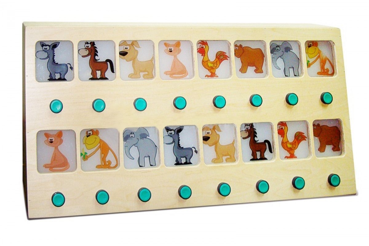 На панели есть 16 кнопок - по 8 в каждом ряду. Над ними расположены изображения слона, собаки, осла, петуха, обезьяны, лошади, кошки и медведя - по 2 изображения каждого животного. При нажатии кнопки из верхнего ряда соответствующее изображение начинает светиться. Цель игры - найти в нижнем ряду идентичное изображение и нажать на кнопку под ним. Если соответствие установлено, воспроизводится звук, который издает выбранное животное. Панель позволяет изучать окружающий мир в игровой форме.
