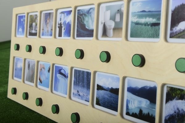На панели 16 кнопок, при нажатии на которые воспроизводятся различные звуки воды - фонтан, дождь, душ, река и пр. Над каждой кнопкой есть соответствующее изображение. Оптимальна для детей с ослабленным зрением. Может использоваться для изучения звуков.