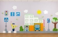 - ожидание транспорта: автобусная остановка с надписью, информационной доской (2 кармана) и 2-мя бизибордами (лабиринты, окошки), знаки, бизиборд в форме автобуса (шестеренки, перекидные карточки), урна, ребенок, подземный переход, куст, облака, птицы, солнышко.