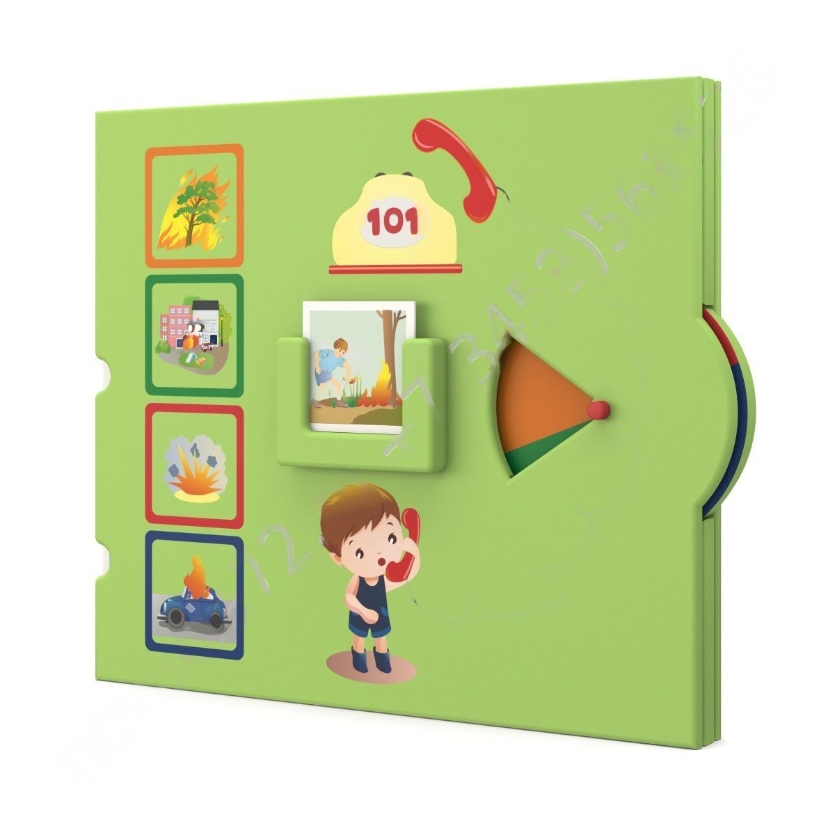 На игровой панели проиллюстрированы случаи с огнем. В цветных окошках нарисованы: горящее дерево, пожар в автомобиле, открытый костер и т.п. Игрок вращает пестрый круг, чтобы определить цвет окошка, с которым будет работать. Необходимо описать ситуацию на картинке и найти выход. Решения (затоптать костер, воспользоваться огнетушителем) есть на тематических карточках. Ребенок выбирает соответствующую. В верхней части панели записан телефонный номер пожарной службы.