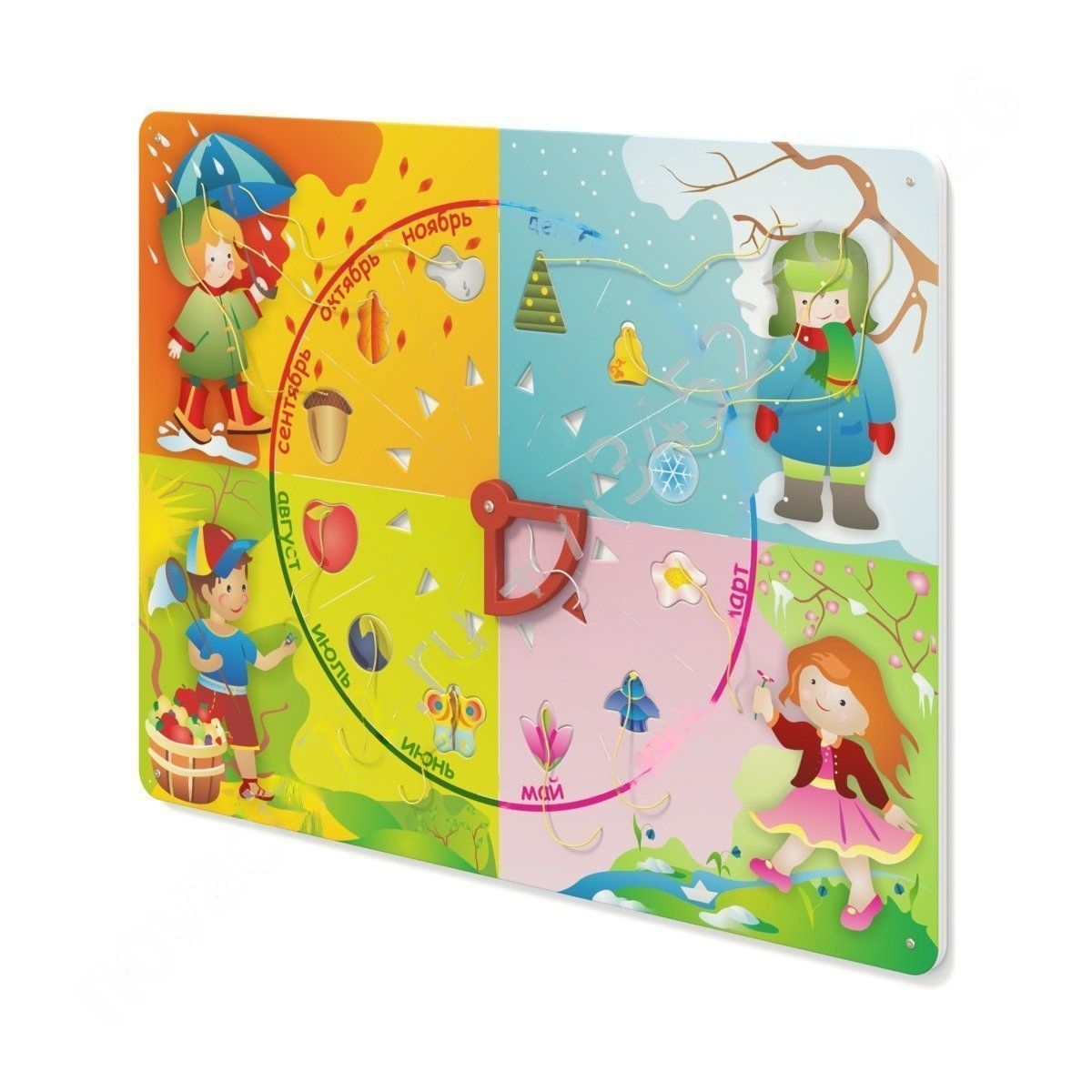 Панель оснащена кругом со стрелкой (элемент выполнен по принципу циферблата). В каждом из 12-ти секторов написано название месяца. Предусмотрено место для фигурных вкладышей: цветка, елочки, осеннего листа и др. Вкладыши держатся на шнурках, которые закреплены за пределами круга.