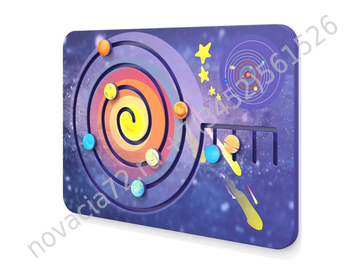 На цветной панели изображены звезды и кометы. Детали в форме планет нужно двигать по спиралевидной прорези. Это позволяет подготовить руку к письму и рисованию, развить межполушарное взаимодействие, узнать о строении Солнечной системы.