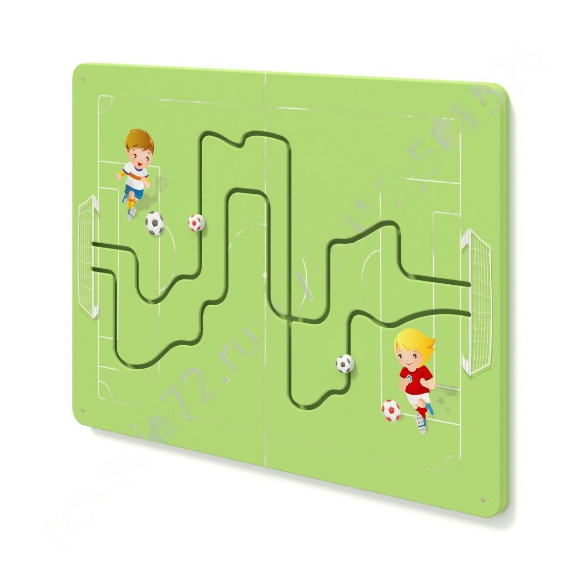 На дидактической панели изображено футбольное поле с игроками, инвентарем. 2 подвижных элемента в виде мячей нужно провести по 2-м лабиринтам (прорезям). Следование по траектории помогает пальцам рук окрепнуть, научиться точным движениям, подготовиться к освоению письма.