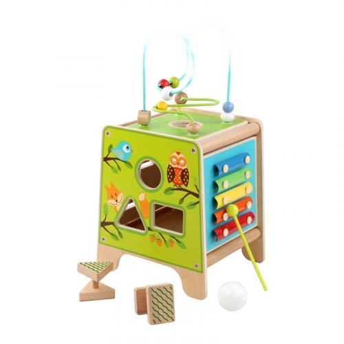 Верхняя рабочая поверхность оборудуется лабиринтом, на боковых гранях куба располагаются ксилофон, сортер, мини-лабиринт с шариком и прорезями, тематические картинки с представителями фауны.