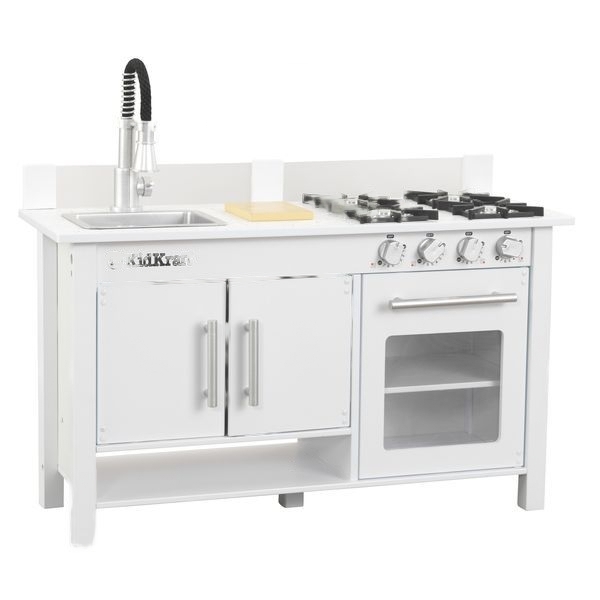 Модуль состоит из рабочей поверхности с раковиной и краном, плиты с 4 конфорками с поворотными ручками, шкафов с открывающимися дверцами и открытой полки. Игры на кухне способствуют развитию воображения, координации и моторики рук.
