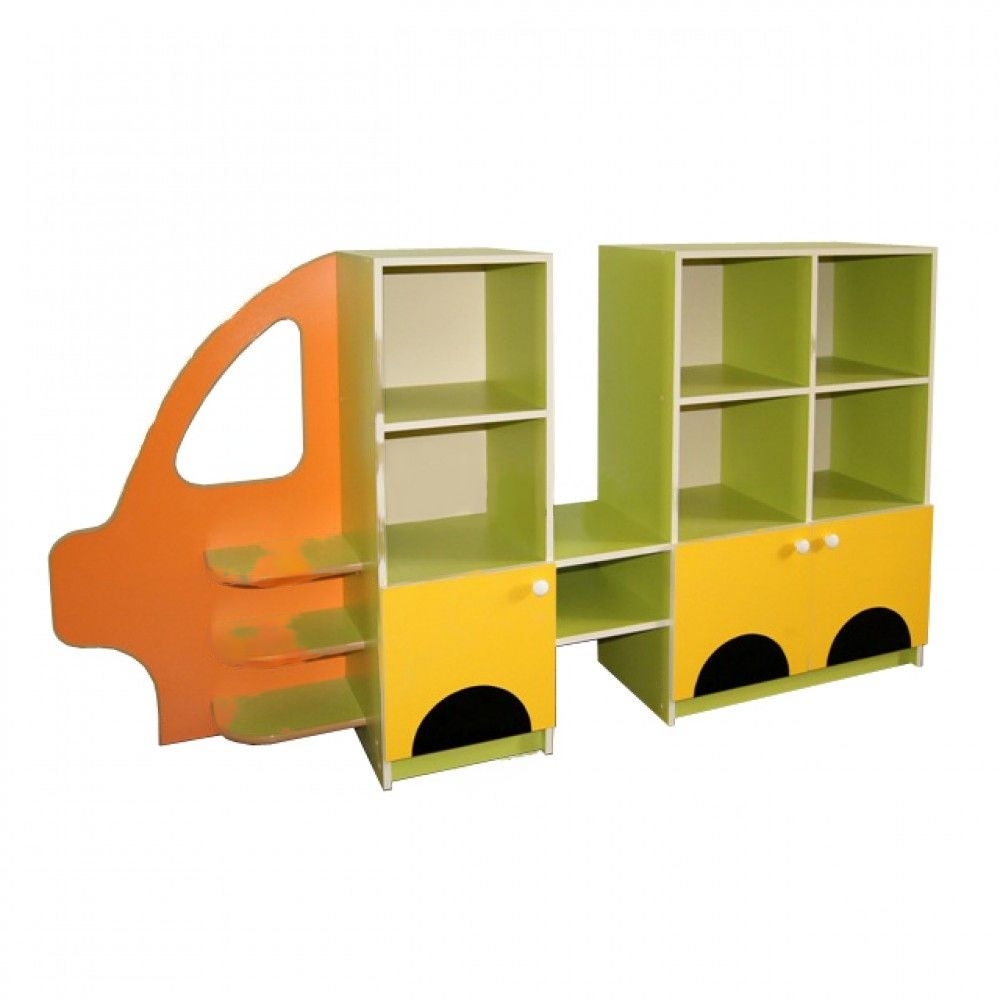 "Машинка" соответствует данным требованиям. 2 модуля соединены 2-мя полками. Первый модуль — декоративная часть, 3 полки со скругленными углами, стеллаж с 3-мя полками и тумбой с дверкой. Вторая часть — 2 стеллажа, 3 полки, 2 тумбы с распашными дверцами.