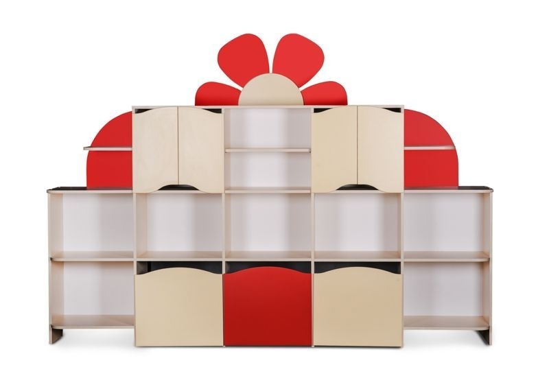 Стенка "Лето" с 3-мя выкатными ящиками и множеством открытых полок используется в детском саду (для хранения игрушек и дидактических пособий). Верхние отделения дополнены 2-створчатыми дверцами и фигурными панелями.
