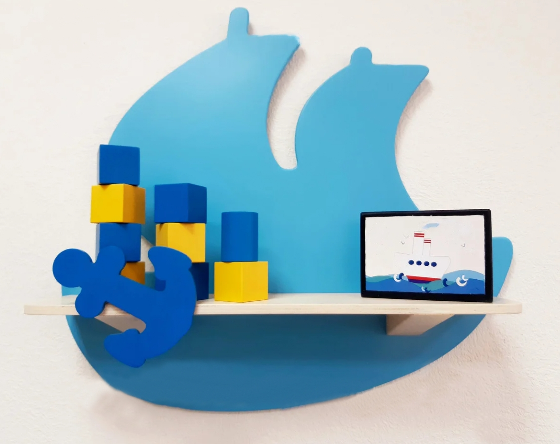 Мебельное изделие для ДОУ состоит из настенной панели в форме парусника, горизонтальной белой полки и аппликации-якоря.