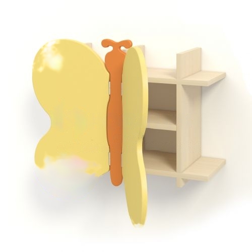Навесная конструкция с цветными панелями и сквозными отделениями подходит для книг, поделок, игрушек. В корпусе 3 горизонтальные поверхности, 1 вертикальная перегородка. Полка украшена декорацией (бабочка с крыльями-створками).