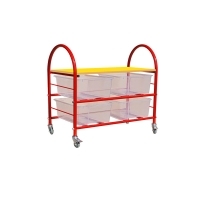 Металлокаркас из труб дополнен прямоугольным топом (верхней полкой). По бокам 2 ручки. Лотки выдвигаются. Конструкция стоит на 4-х поворотных колесах. Усиленные элементы покрыты резиной. Для фиксации на месте предусмотрено 2 стопора.