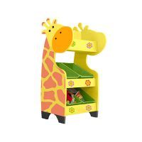 Стеллаж для хранения игрушек и наборов стоит на 4-х ножках. Боковые панели выполнены в форме жирафа. Наклонные полки оснащены контейнерами без крышек (295х395х140 мм). Стенки и фасады шкафа украшены трафаретным рисунком.