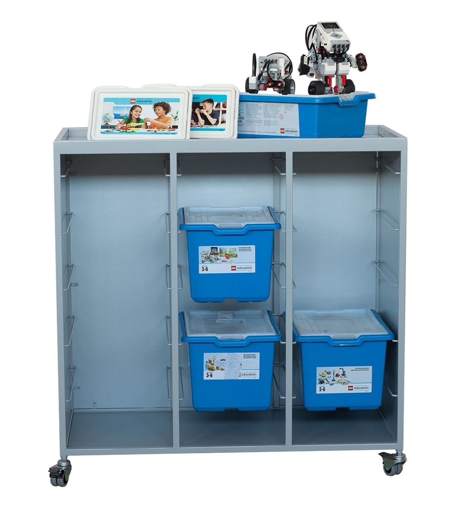 Мобильная система хранения используется в ДОУ и школе. Представляет собой металлический шкафчик-тумбу с 3-мя открытыми вертикальными отделениями. На боковых стенках каждого отсека есть пазы, позволяющие закреплять друг над другом контейнеры с деталями конструкторов и инструментами.