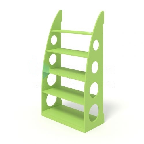 Детский стеллаж состоит из 5-ти открытых полок и боковых панелей, которые сужаются наверху. Глубина отделений уменьшается от нижнего к верхнему. Самая вместительная полка служит основанием. Стенки мебели украшены декоративными отверстиями.