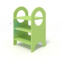 В стеллаже по 3 полки между стойками с дугообразным верхом. Конструкция украшена круглыми отверстиями.