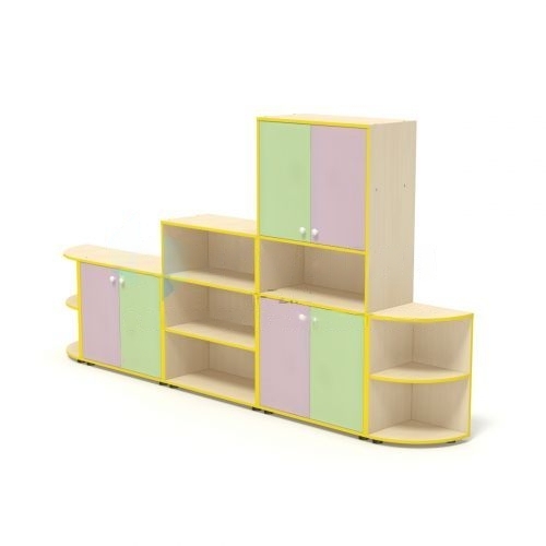 - 3 закрытых шкафчика (2 нижних и 1 верхний) с разноцветными 2-хстворчатыми дверцами,