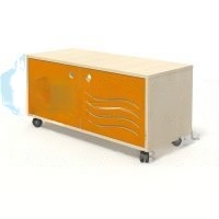 Стеллаж с перегородкой и 2-мя дверцами подходит для хранения пособий, инвентаря, игрушек. Задействуется при зонировании. Прямоугольный корпус стоит на 4-х колесах со стопорами, d 82 мм. При необходимости топ служит полкой. Створки дверей дополнены прорезями: круглые отверстия для открывания, изогнутые линии для вентиляции.