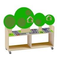 Столешница покрыта красочной УФ-печатью (изображение городской дороги с машинами, знаками и разметкой). Топ дополняют декорации в форме деревьев с полками-скворечниками. По бокам предусмотрено 2 бортика, края закруглены. 2 из 4-х поворотных колес оснащены стопором.