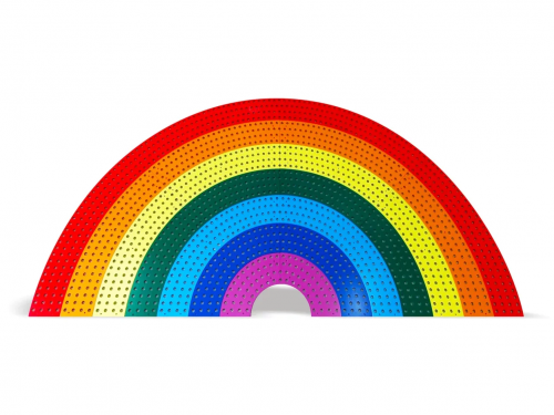 Панель выполнена в виде радуги. На поверхности есть круглые отверстия, которые служат для крепления держателей. Таким образом, панель не только выполняет эстетическую функцию, но и защищает стены от повреждений и позволяет закреплять различные предметы без необходимости сверлить стены.