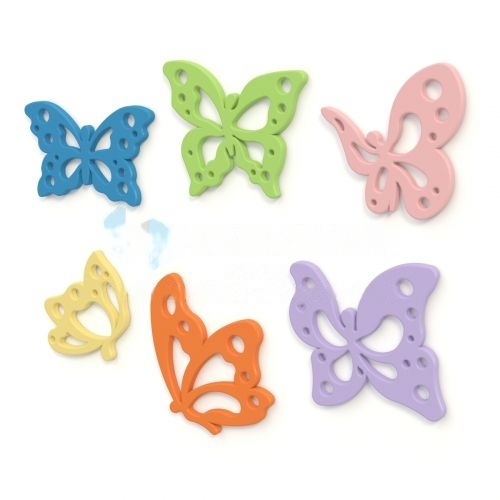 Набор состоит из шести разноцветных элементов в виде бабочек. Декорации предназначены для крепления на стену.