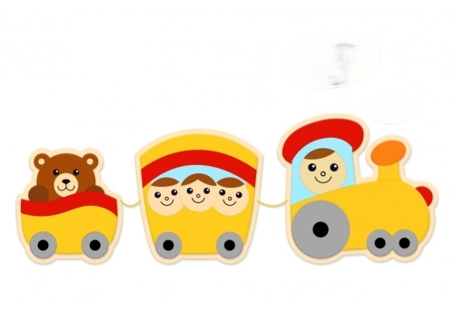 Составная декоративная панель для ДОУ включает в себя 3 части (кабина машиниста, вагон с человечками, вагон с медвежонком), которые соединяются веревочками.