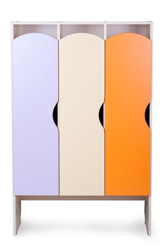 Детский шкаф для одежды безопасный и компактный, вместо ручек вырезы, под шкафчик может задвигаться скамейка для экономии места. В каждом отделении 2 металлических крючка и 2 полки (вверху и внизу). Дверца закруглена в верхней части для лучшего проветривания.