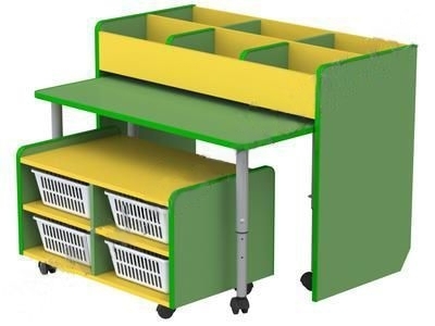 Материал изготовления: Ламинированное ДСП, Кромка ПВХ (2мм). Многофункциональный компактный модуль для развивающей деятельности включает в себя тумбу-витрину для хранения книг, прямоугольный выкатной стол на регулируемых ножках и тумбу оснащенную корзинами на колесах. Колеса оснащены специальными стопорами для предотвращения произвольного движения. Уголок предназначен для различной творческой деятельности детей. Вместительные ячейки для книг, широкий стол для 2 детей, мобильная тумба с корзинами для игрушек, позволят воспитателям детских садов проводить с детьми занятия различной направленности, а у детей появится интерес к обучению.