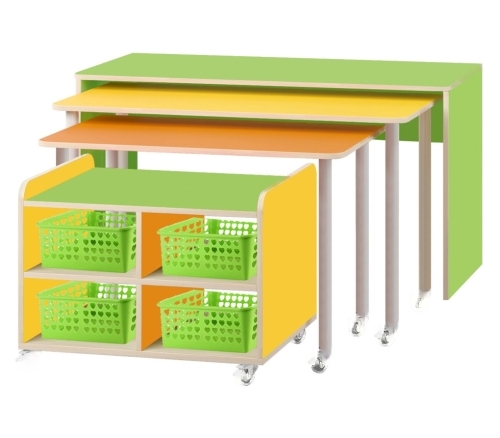 Комплект мебели из трех столов и выкатной тумбы подходит для кабинетов начальной школы, комнат детского сада.