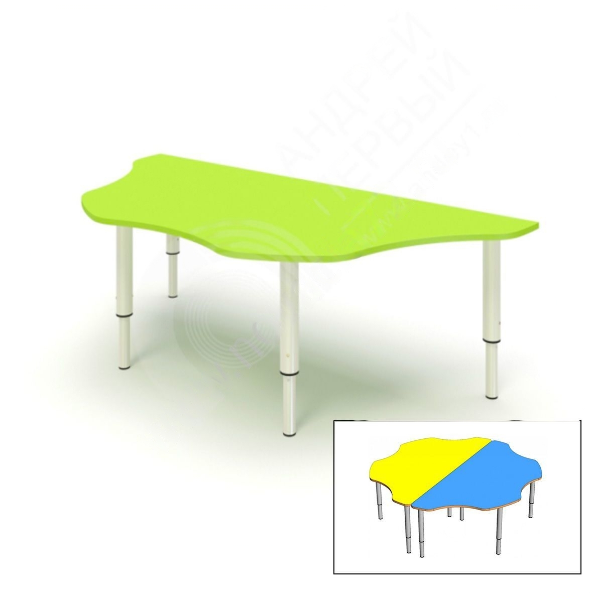 Рабочая поверхность выполнена в форме половины цветка: одна сторона прямая, контуры других повторяют ломаную линию. Такой стол можно дополнять аналогичной моделью или ставить возле стены.
