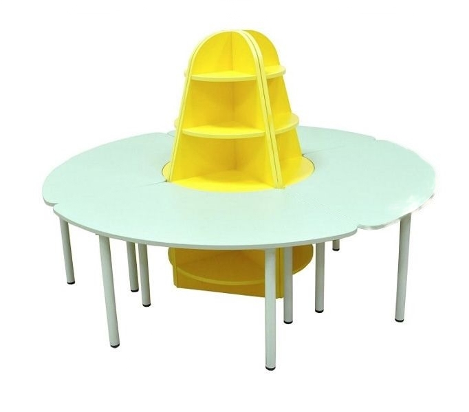 Дидактический набор мебели для школ, ДОУ, иных муниципальных учреждений, собран из четырёх угловых стоек и четырёх столов. Представляет собой круговую композицию. Аккуратные и пропорциональные элементы прекрасно сочетаются между собой; дают возможность работать в комфортных условиях. Полки полуоткрытого типа, которыми оснащены стойки, позволяют размещать дидактические наборы и игрушки, книги. Ножки под столешницами в форме сектора дополнены специальными заглушками, которые не царапают пол. Можно установить две стойки и два стола к стене или одну стойку и один стол в угол помещения.