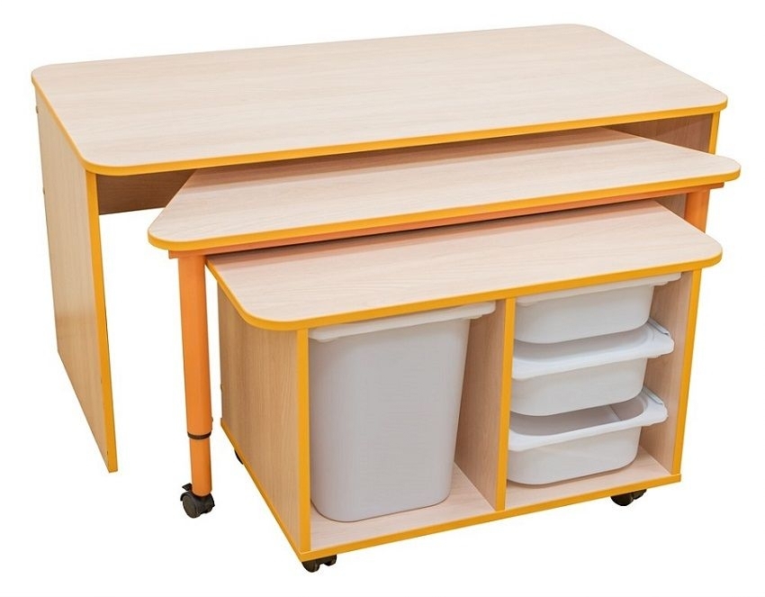 Модульный набор со столом трапецией включает в себя: стол детский (ширина 118 см, глубина 60 см, высота 58 см), стол детский регулируемый на колесиках (ширина 110 см, глубина 50 см, высота регулируемая от 46 до 64 см) , тумба мобильная с лотками (ширина 78,4 см, глубина – 45 см, высота – 46,7 см).