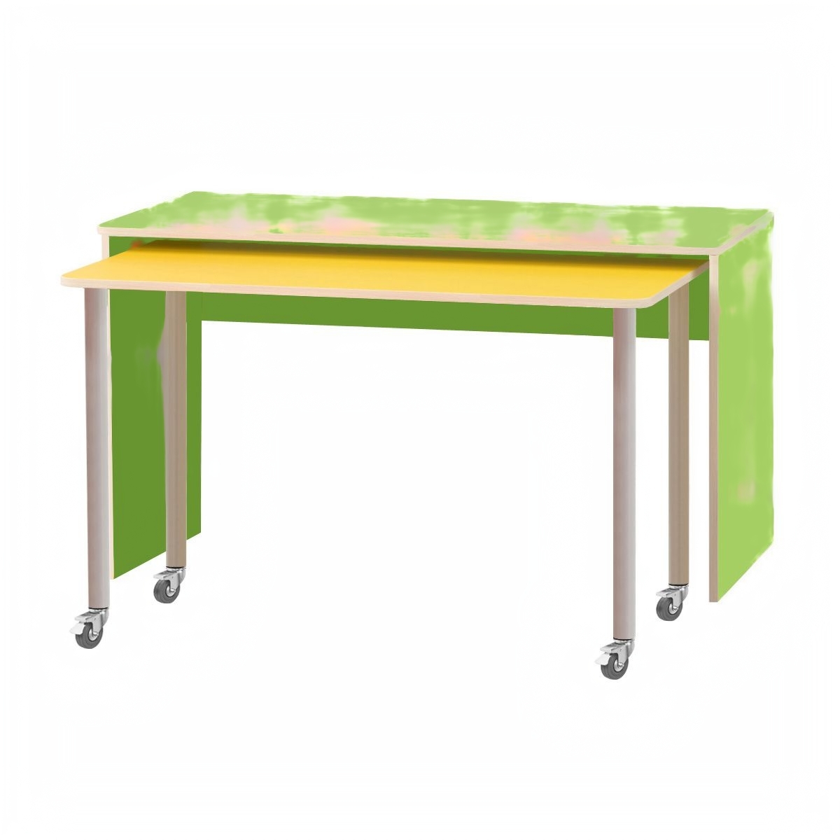 Комплект мебели для ДОУ и младшей школы сочетает в себе ненавязчивый дизайн и функциональность. Каждый из столов предназначен для 2-х человек. Неодинаковая высота позволяет работать с детьми из разных ростовых групп — 1 и 2 или 3 и 4 (на выбор). Столешницы прямоугольной формы тщательно обработаны, у выкатной модели скруглены углы. Колесные опоры дополняются специальными фиксаторами, которые предотвращают непроизвольное смещение стола во время игр и выполнения заданий. Возможно оснащение выкатной модели усиленными прорезиненными колесными опорами.
