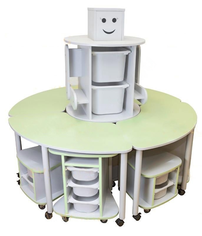 Модуль с поворотной тумбой и мобильными столами, а также выкатной тумбой, подходит для размещения в ДОУ. Выполнен в виде улыбающегося робота, что, несомненно, вызовет у малышей любопытство и симпатию.