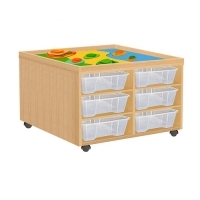 Стол-тумба используется в ДОУ и школах. Передвигается из кабинета в кабинет и фиксируется на время занятий колесными опорами со стопорным механизмом. Дополнен контейнерами для хранения наборов.