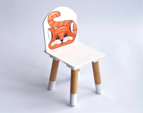 - изображение котенка на спинке, узор на сиденье, оранжевый цвет.