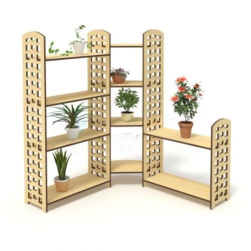 Угловой стеллаж состоит из 3-х частей: в одной-2 полки, в остальных секциях по 4 полки, которые можно устанавливать на разную высоту. Отделения подходят для цветоводства, размещения небольших клеток с животными. Конструкция задействуется при зонировании. У полок с 2-х сторон перфорированные стенки.