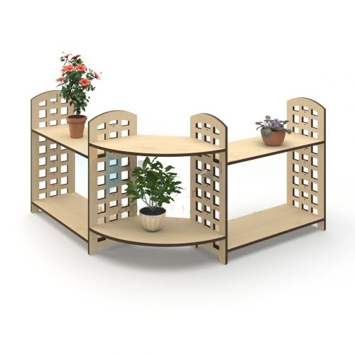 Угловой стеллаж состоит из трех секций и шести полок, секции расположены под углом 90 градусов. Полки можно переставлять по разной высоте. Предназначен для размещения растений в горшках, а также инвентаря для ухода за ними.