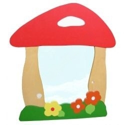 Фигурное зеркало оснащено противоударной пленкой. Настенный корпус оформлен в виде домика с цветами. Планка с металлическими навесами для крепления расположена на оборотной стороне .